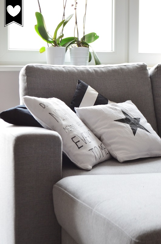Czarno-białe poduchy w paski, z gwiazdką czy reniferem nadal bardzo nam się podobają i póki co nie zamierzamy ich zmieniać na bardziej kolorowe.