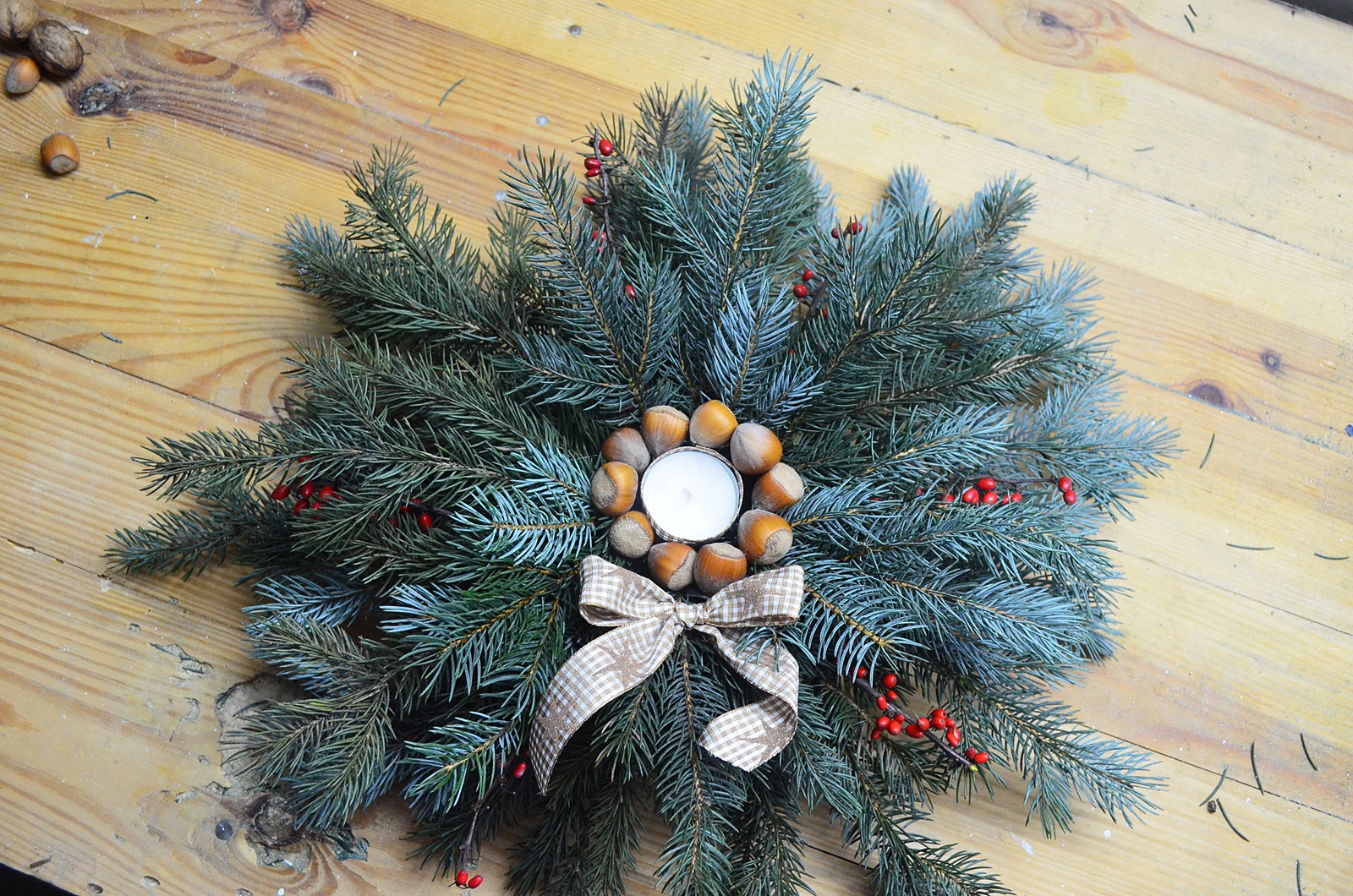 Na koniec do środka wkładamy świeczkę, kilka orzechów do ozdoby i zawiązujemy wstążkę.